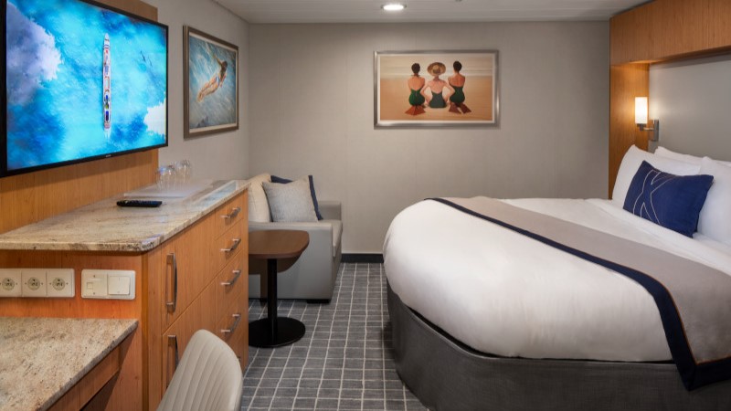 These interior staterooms feature two twin beds that can be converted to a king size bed, flat-screen TV, vanity area, and private bathroom. Some of these staterooms have additional bedding to accommodate a 3rd and 4th guest.