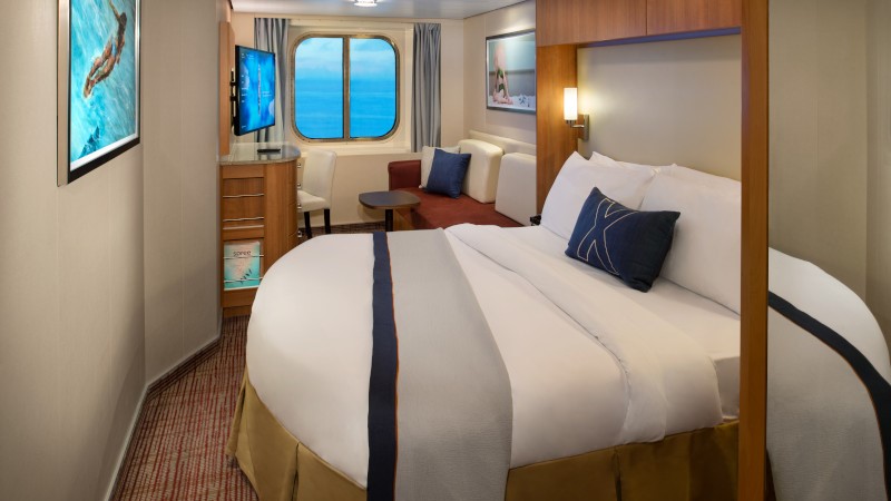 In an Oceanview stateroom, you’ll be treated to an amazing new view every day! Oceanview cabins have two lower beds that convert into a king-size bed. Some of these have additional bedding to accommodate a 3rd and 4th guest.